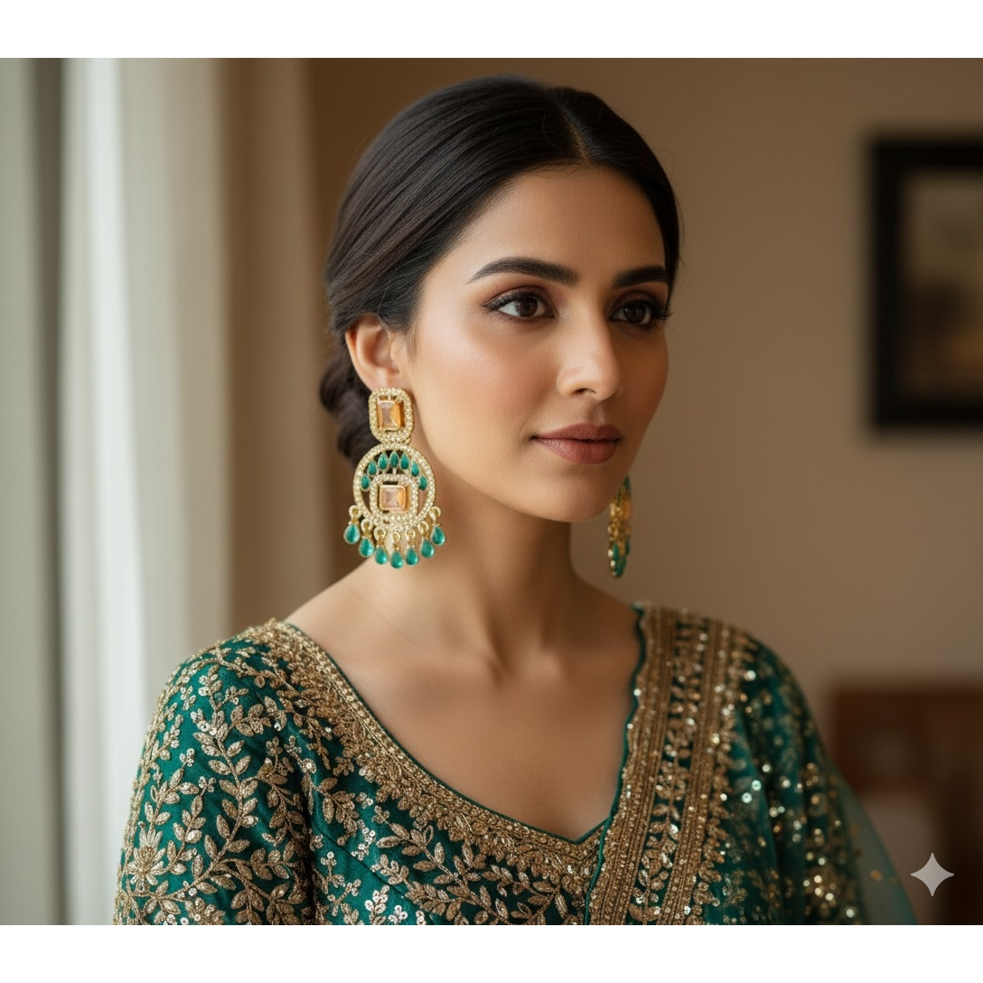 Styled against soft satin and delicate blooms, these Emerald Glow Kundan Earrings radiate timeless charm. The warm champagne center stones are framed with sparkling kundan work, while emerald green drops add a fresh, graceful movement to the design.